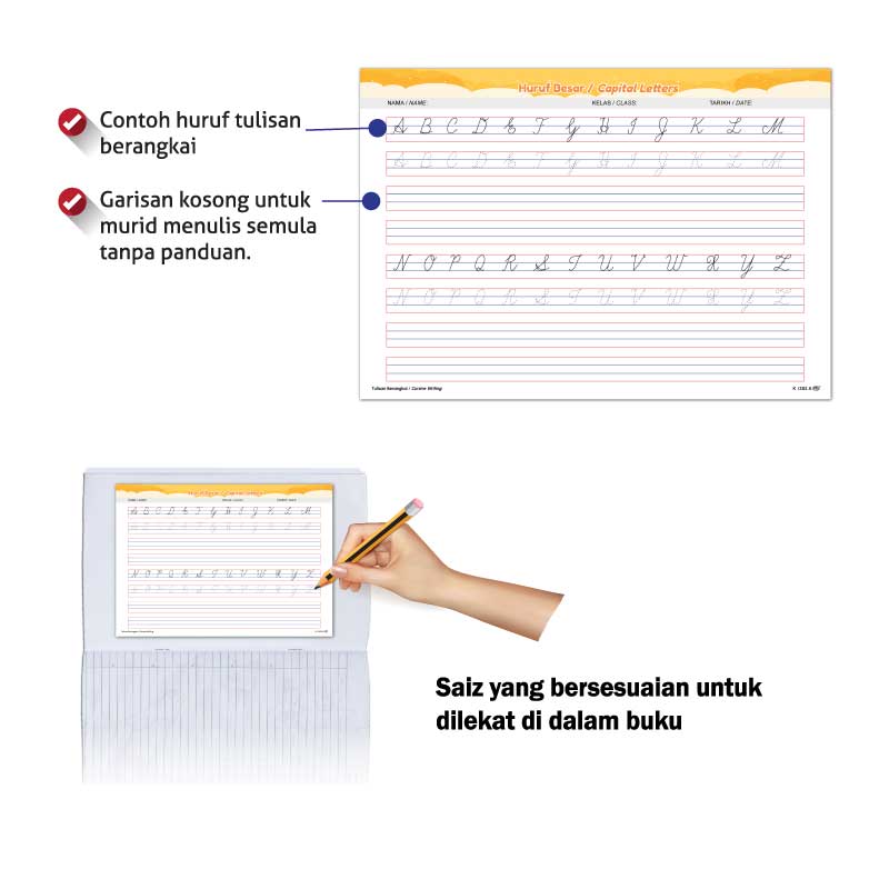 - Direka mesra murid – ada garisan panduan & contoh huruf berangkai.